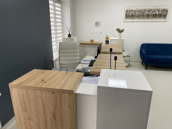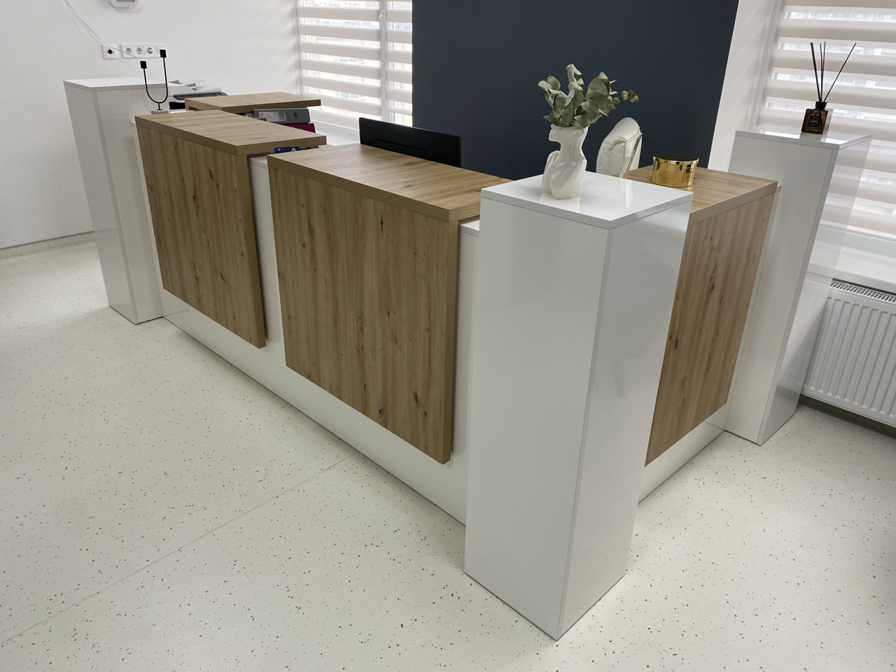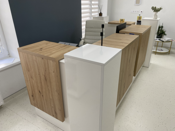 Рецепція: меблі виготовлені з урахуванням ергономіки та потреб персоналу. Стійка рецепції виконана в мінімалістичному стилі з якісних матеріалів, що підкреслюють сучасний характер закладу.