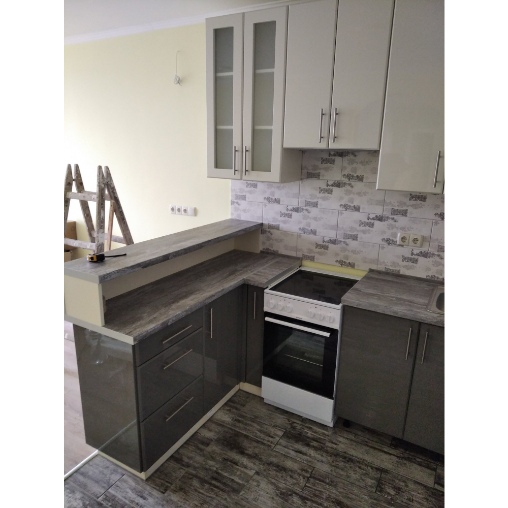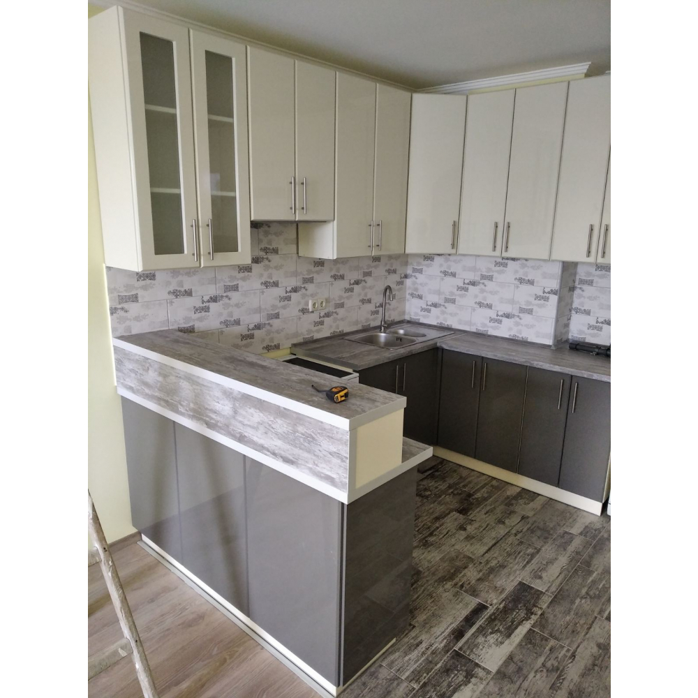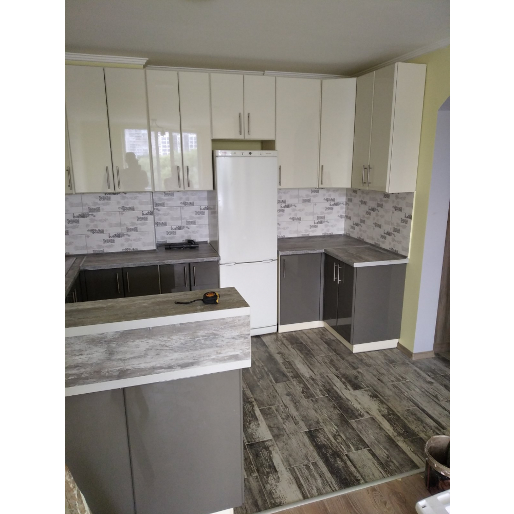 Це стильна і сучасна кутова кухня у модерновому стилі.Торці ДСП(Корпусу) кромковані PCV - 1 мм.Меблева фурнітура: напрявляючі та завіси з функцією дотягу.Стільниця товщиною 38 мм.Колір ручок - Сатин.Розмір: Індивідуально.Гарантія: На фасад, механізми та стільниці.