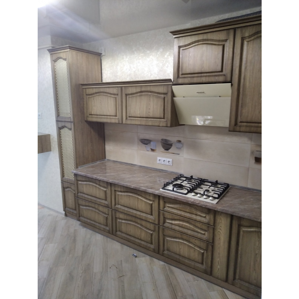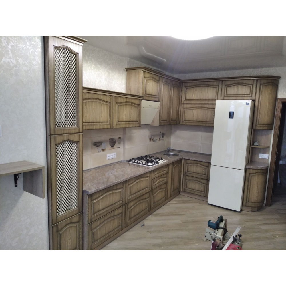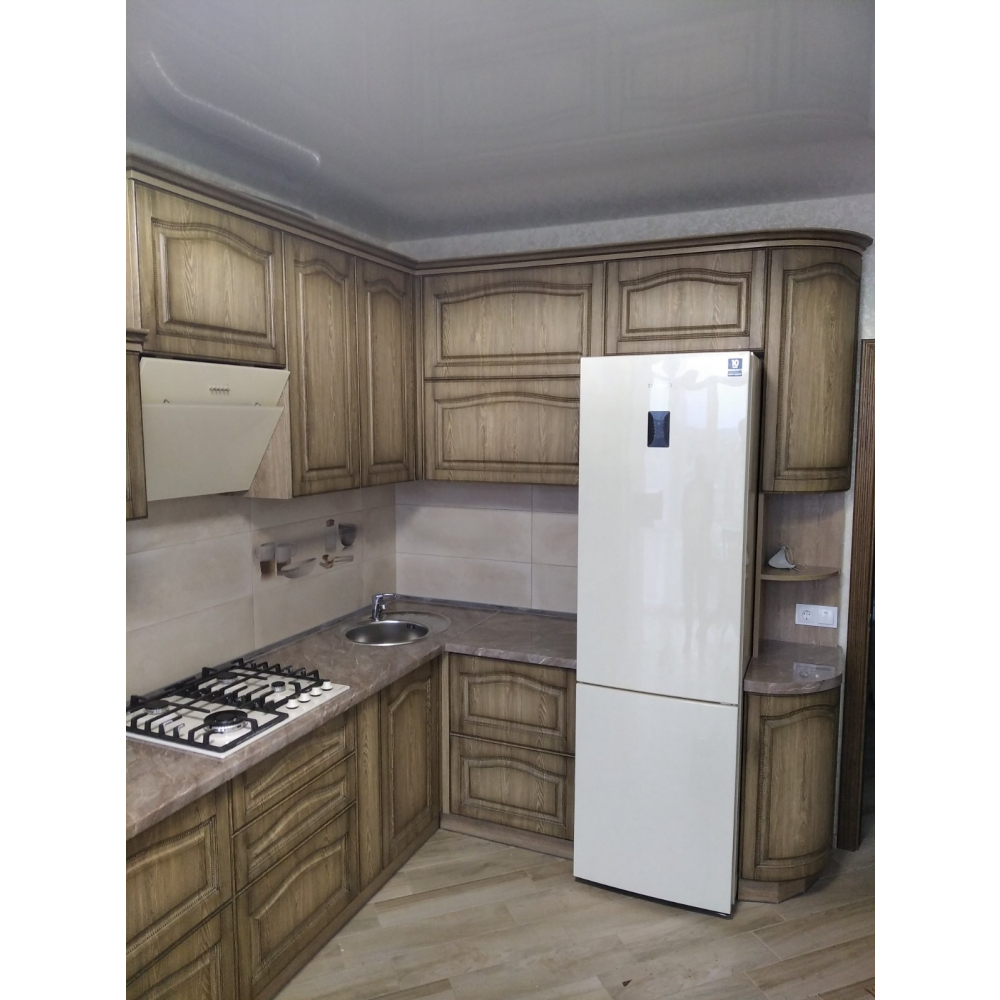Це чудова та дуже стильна кутова кухня.Торці ДСП (Корпусу) кромковані PCV - 1 мм.Меблева фурнітура: напрявляючі та завіси з функцією дотягу.Стільниця товщиною 38 мм.Розмір: Індивідуально.Тубмочки при нажимані самі відкриваються.Гарантія: На фасад, механізми та стільниці.