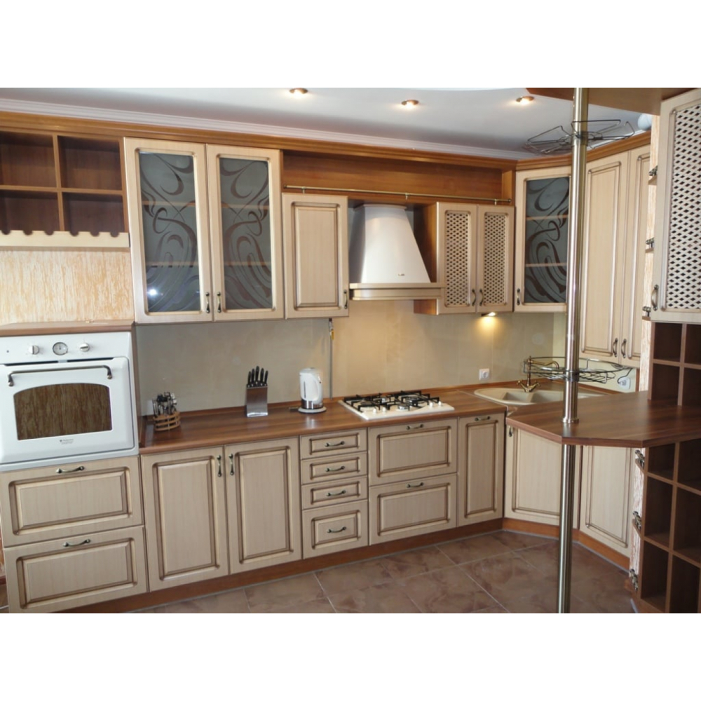 Це чудова та колоритна кухня.Торці ДСП (Корпусу) кромковані PCV - 1 мм.Меблева фурнітура: напрявляючі та завіси з функцією дотягу.Стільниця товщиною 38 мм.Розмір: Індивідуально.Колір ручок: Срібло.Гарантія: На фасад, механізми та стільниці.