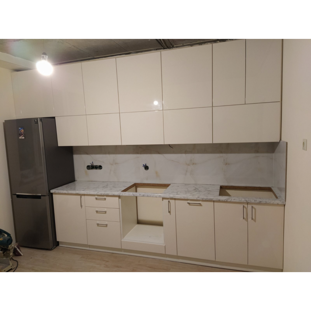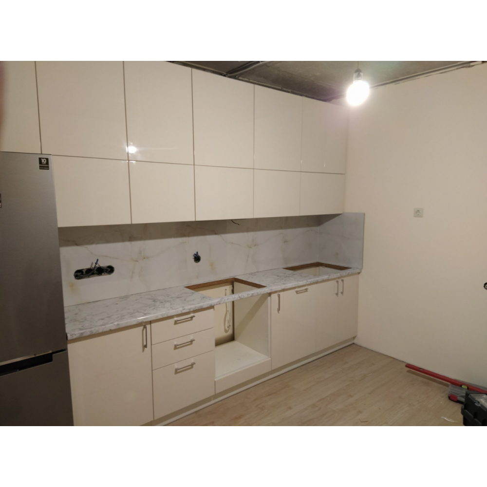 Це чудова кухня у модерновому МДФ стилі. Торці ДСП(Корпусу) кромковані PCV - 1 мм.Меблева фурнітура: напрявляючі та завіси з функцією дотягу.Стільниця товщиною 38 мм.Колір ручок - Сатин.Розмір: Індивідуально.Гарантія: На фасад, механізми та стільниці.