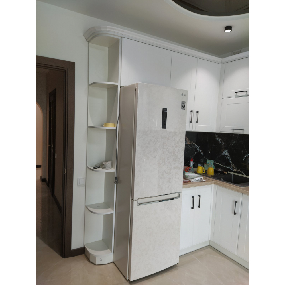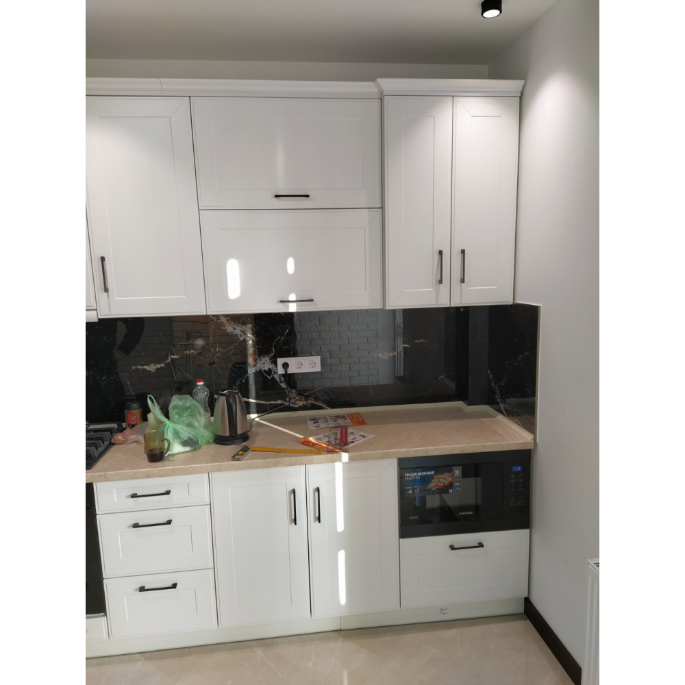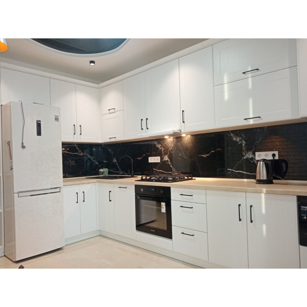 Модна і сучасна кутова кухня.Торці ДСП (Корпусу) кромковані PCV - 1 мм.Меблева фурнітура: напрявляючі та завіси з функцією дотягу.Стільниця товщиною 38 мм.Розмір: Індивідуально.Колір ручок - Хром.Гарантія: На фасад, механізми та стільниці.