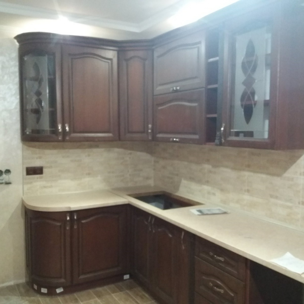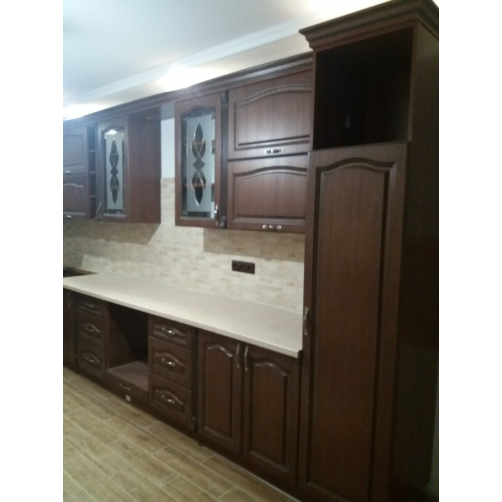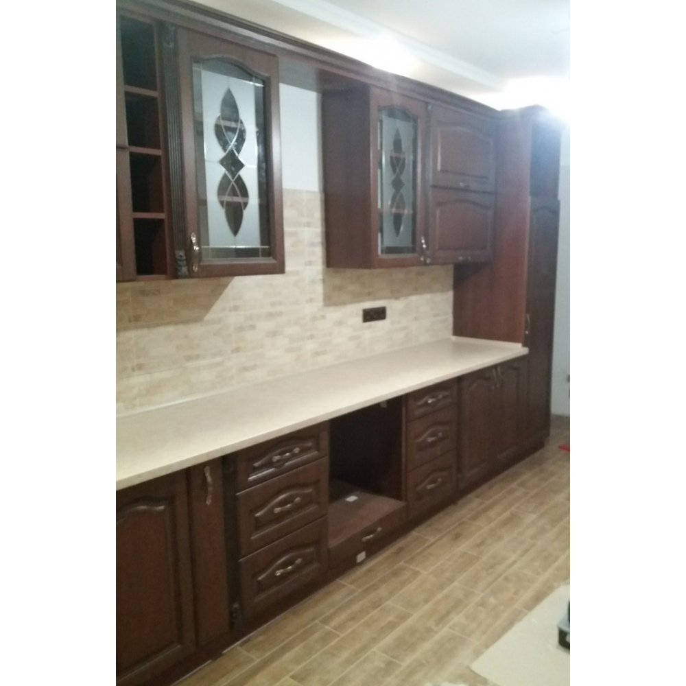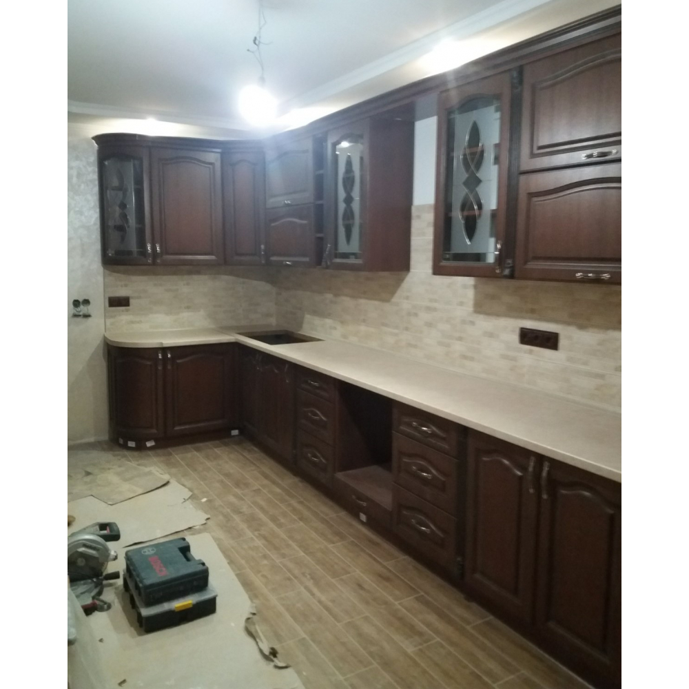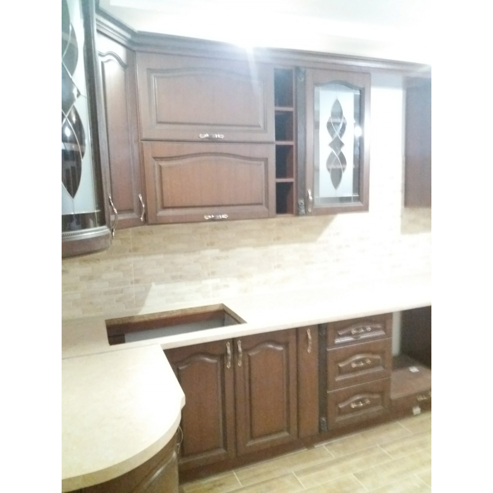Стильна і комфортна кутова кухня.Торці ДСП (Корпусу) кромковані PCV - 1 мм.Меблева фурнітура: напрявляючі та завіси з функцією дотягу.Стільниця товщиною 38 мм.Розмір: Індивідуально.Колір ручок - Срібло.Гарантія: На фасад, механізми та стільниці.