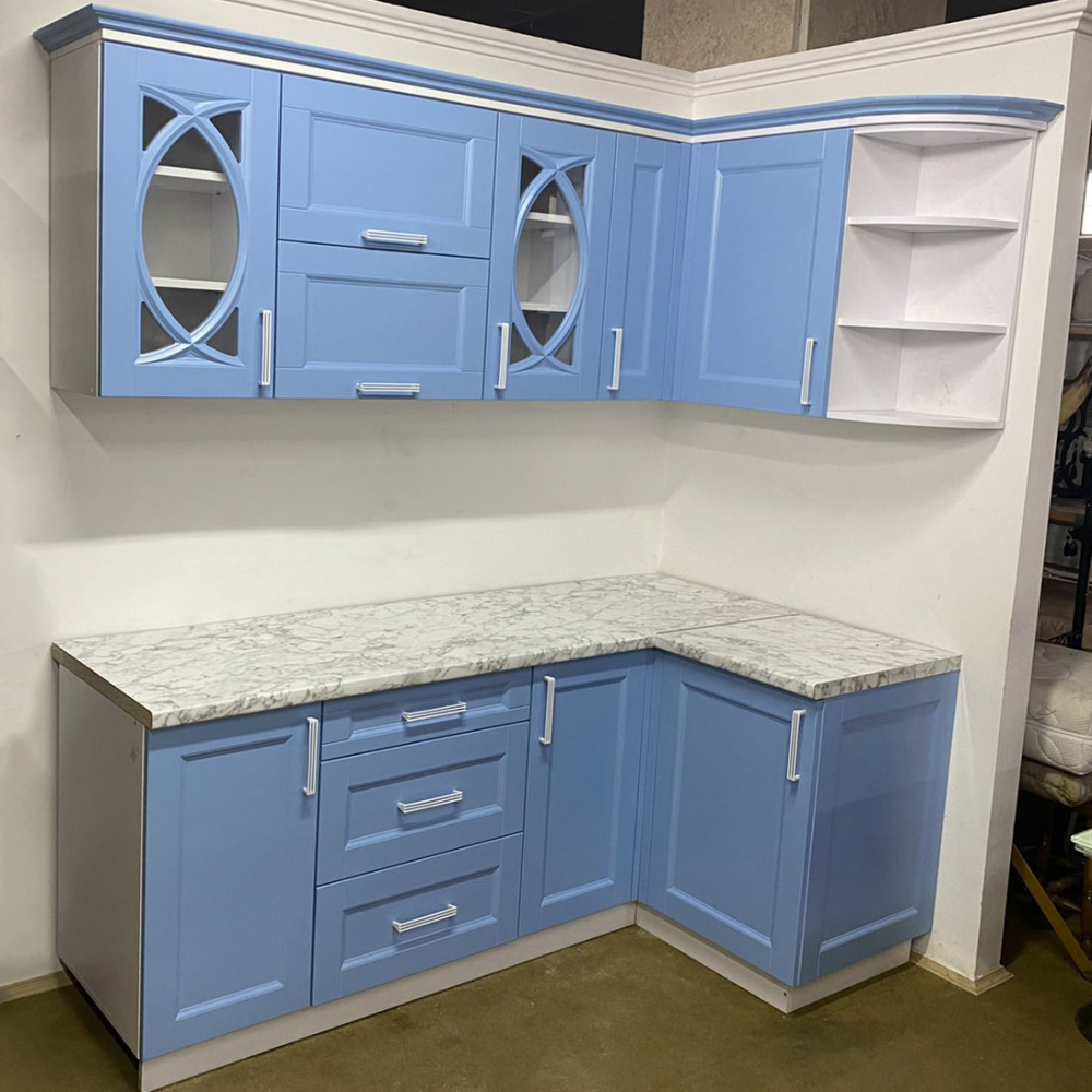 Стильна і сучасна кутова кухня.Торці ДСП (Корпусу) кромковані PCV - 1 мм.Меблева фурнітура: напрявляючі та завіси з функцією дотягу.Стільниця товщиною 38 мм.Розмір: Індивідуально.Колір ручок - Срібло.Гарантія: На фасад, механізми та стільниці.