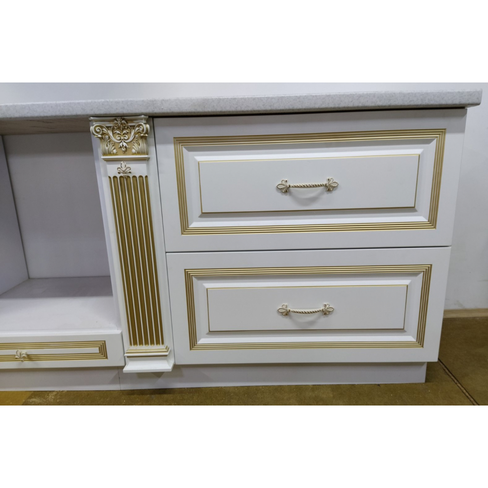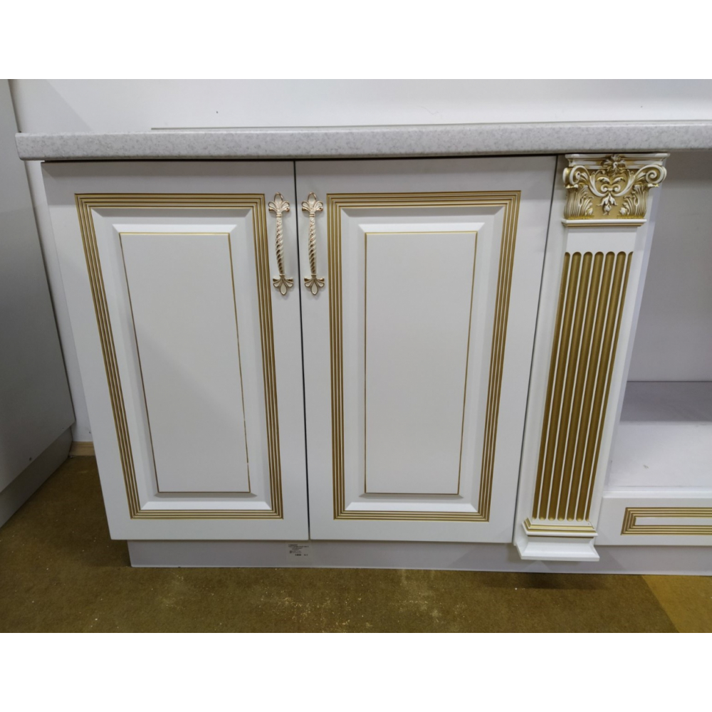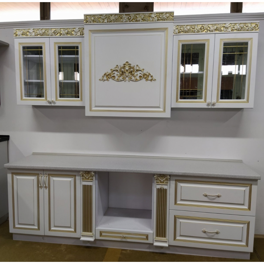 Стильна і сучасна пряма кухня.Торці ДСП (Корпусу) кромковані PCV - 1 мм.Меблева фурнітура: напрявляючі та завіси з функцією дотягу.Стільниця товщиною 38 мм.Розмір: Індивідуально.Колір ручок - Золото.Гарантія: На фасад, механізми та стільниці.