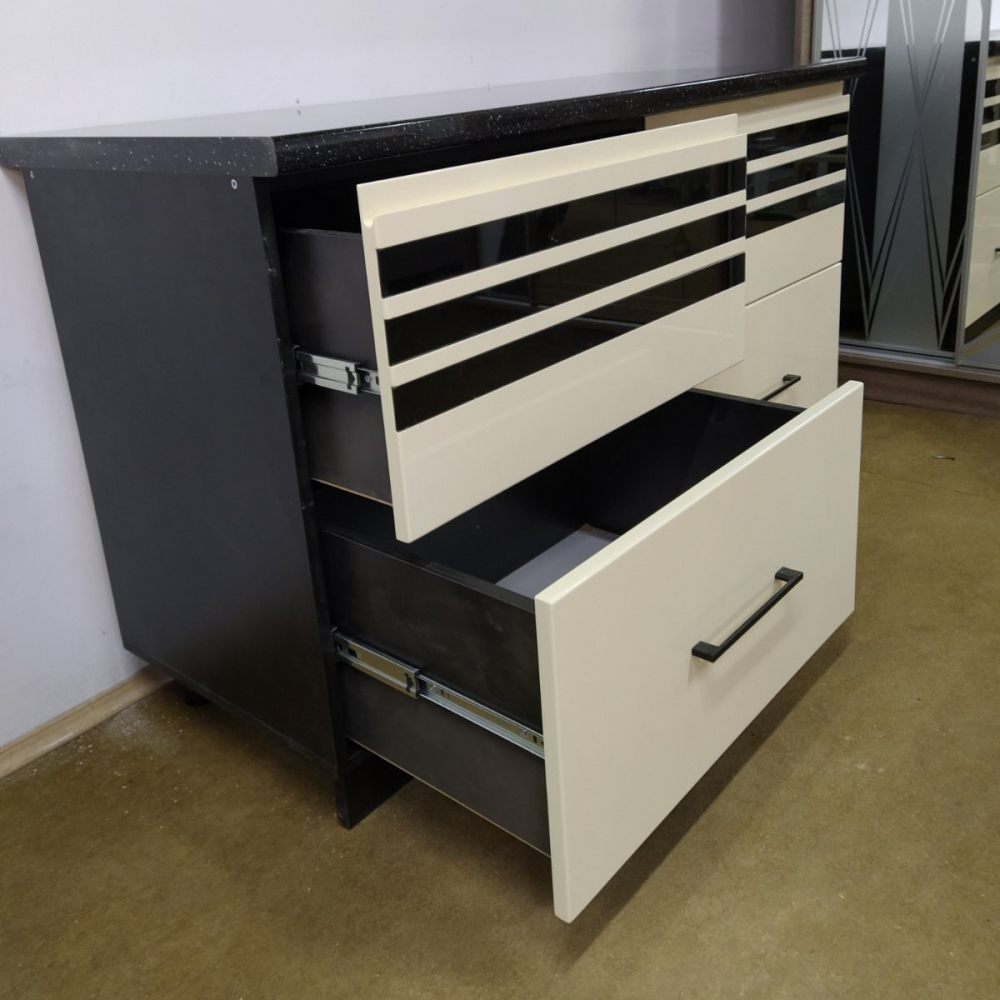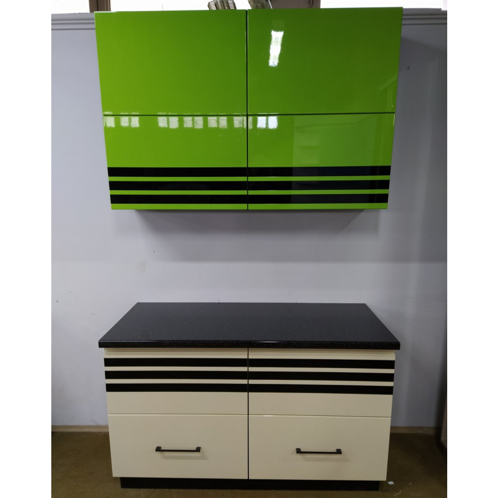 Стильна і сучасна пряма кухня.Торці ДСП (Корпусу) кромковані PCV - 1 мм.Меблева фурнітура: напрявляючі та завіси з функцією дотягу.Стільниця товщиною 38 мм.Розмір: Індивідуально.Колір ручок - Хром.Гарантія: На фасад, механізми та стільниці.