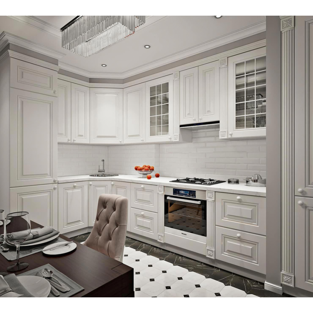 Це строга та солідна кутова кухня, що стане прекрасним вибором для вашої кухні мрії.Торці ДСП (Корпусу) кромковані PCV - 1 мм.Меблева фурнітура: напрявляючі та завіси з функцією дотягу.Стільниця товщиною 38 мм.Розмір: Індивідуально.Колір ручок: Білий.Гарантія: На фасад, механізми та стільниці.