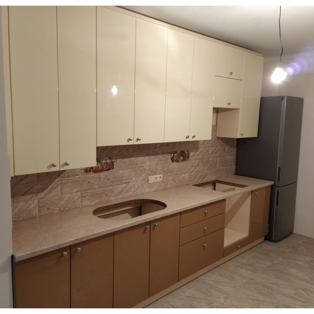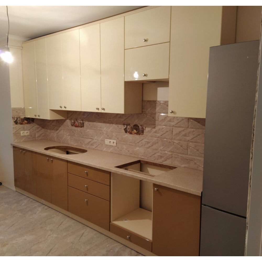 Це прекрасна та чудова кухня вашої мрії.Торці ДСП (Корпусу) кромковані PCV - 1 мм.Меблева фурнітура: напрявляючі та завіси з функцією дотягу.Стільниця товщиною 38 мм.Розмір: Індивідуально.Колір ручок: Золото.Гарантія: На фасад, механізми та стільниці.