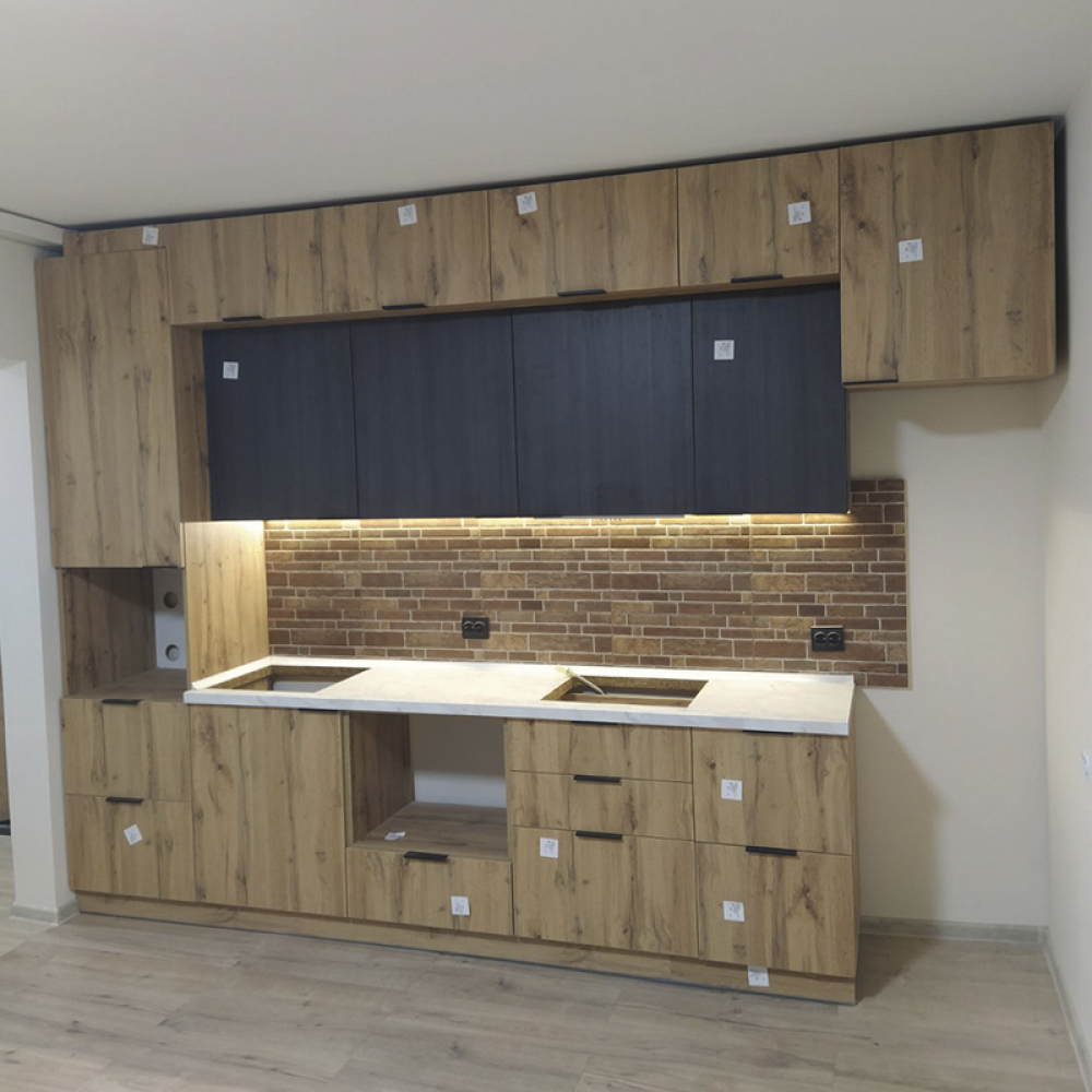 Це стильна і сучасна кухня у модерновому стилі.Торці ДСП (Корпусу) кромковані PCV - 1 мм.Меблева фурнітура: напрявляючі та завіси з функцією дотягу.Стільниця товщиною 38 мм.Розмір: Індивідуально.Гарантія: На фасад, механізми та стільниці.