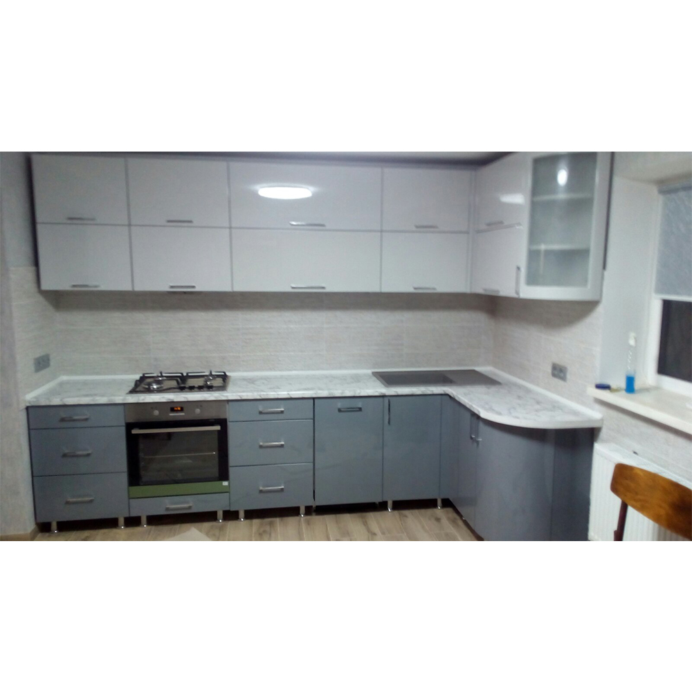 Кутова кухня, яка добре вам послужить. Торці ДСП (Корпусу) кромковані PCV - 1 мм. Меблева фурнітура: напрявляючі та завіси з функцією дотягу. Стільниця товщиною 38 мм. Розмір: Індивідуально. Колір ручок - Сатин. Гарантія: На фасад, механізми та стільниці.