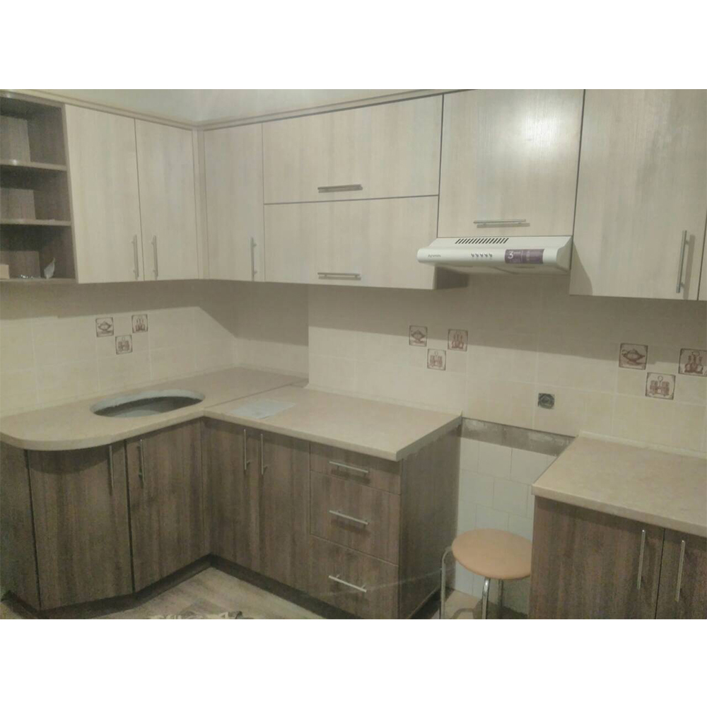 Вишукана кутова кухня. Торці ДСП (Корпусу) кромковані PCV - 1 мм. Меблева фурнітура: напрявляючі та завіси з функцією дотягу. Стільниця товщиною 38 мм. Розмір: Індивідуально. Колір верхніх ручок - Сатин. Гарантія: На фасад, механізми та стільниці.