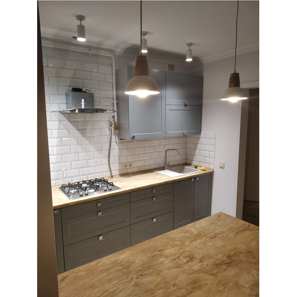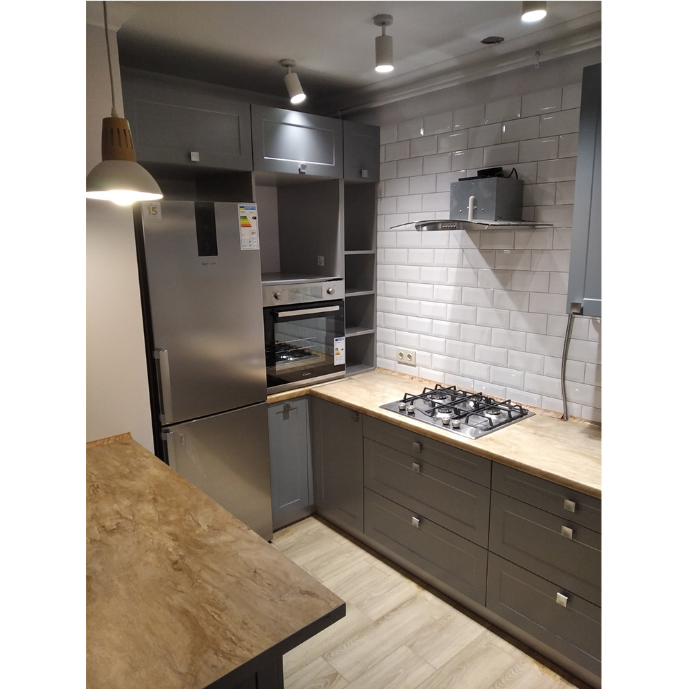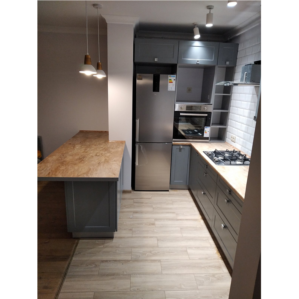 Вишукана і стильна кутова кухня з барною стійкою. Торці ДСП (Корпусу) кромковані PCV - 1 мм. Меблева фурнітура: напрявляючі та завіси з функцією дотягу. Стільниця товщиною 38 мм. Розмір: Індивідуально. Колір верхніх ручок - Хром. Гарантія: На фасад, механізми та стільниці.