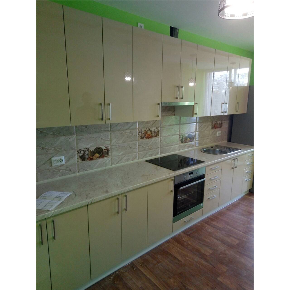 Це пряма кухня. Торці ДСП (Корпусу) кромковані PCV - 1 мм. Меблева фурнітура: напрявляючі та завіси з функцією дотягу. Стільниця товщиною 38 мм. Розмір: Індивідуально. Колір верхніх ручок - Сатин. Гарантія: На фасад, механізми та стільниці.