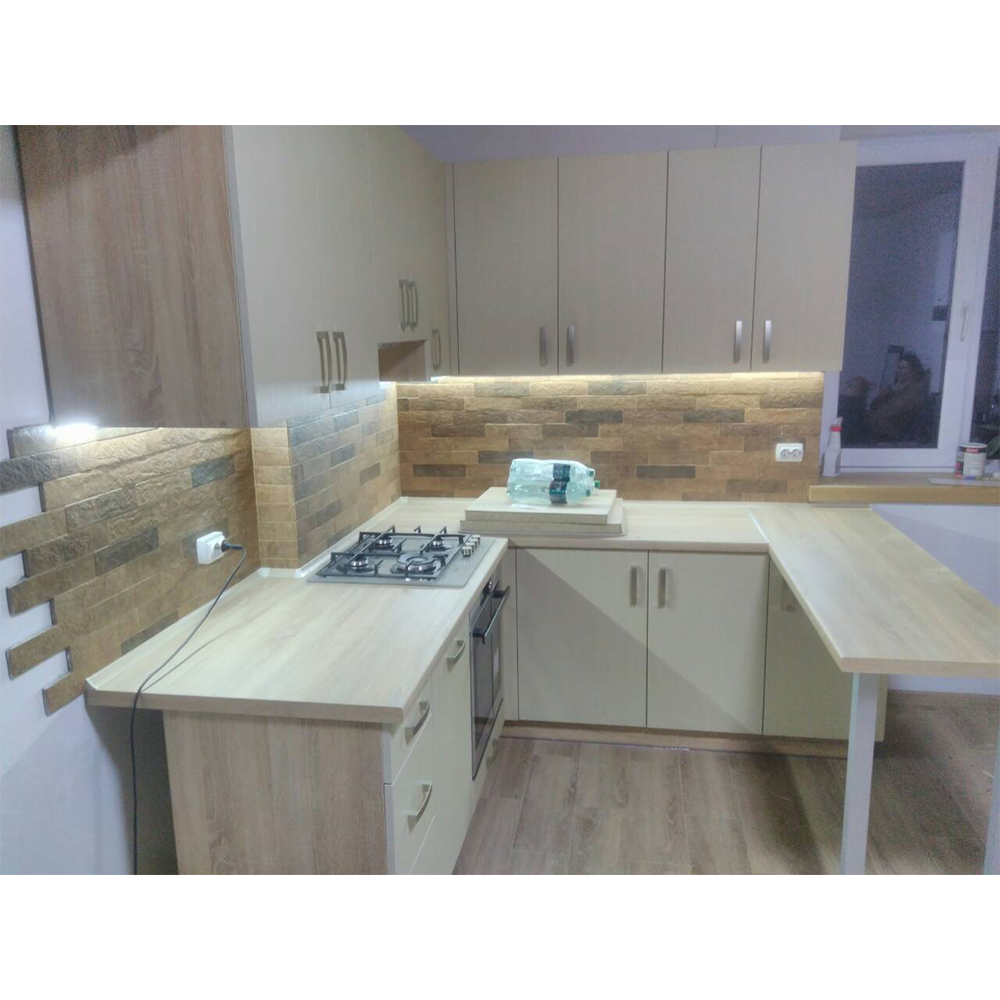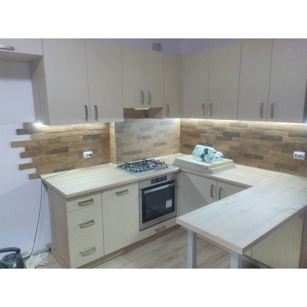 Кухня з барною стійкоюФасад виготовленний з фарбованого МДФ. Меблева фурнітура: напрявляючі та завіси з функцією дотягу. Торці ДСП(Корпусу) кромковані PCV - 1 мм.Стільниця товщиною 38 мм.Розмір: Індивідуально.Колір ручок - Сатин.Гарантія: На фасад, механізми та стільниці.