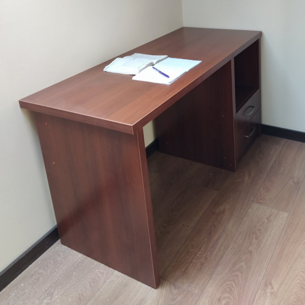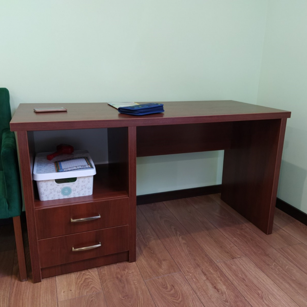 Зручний писемний стіл з великою робочою поверхньою. З лівого боку міститься простора поличка і 2 тумбочки.Колір ручок: Золотий