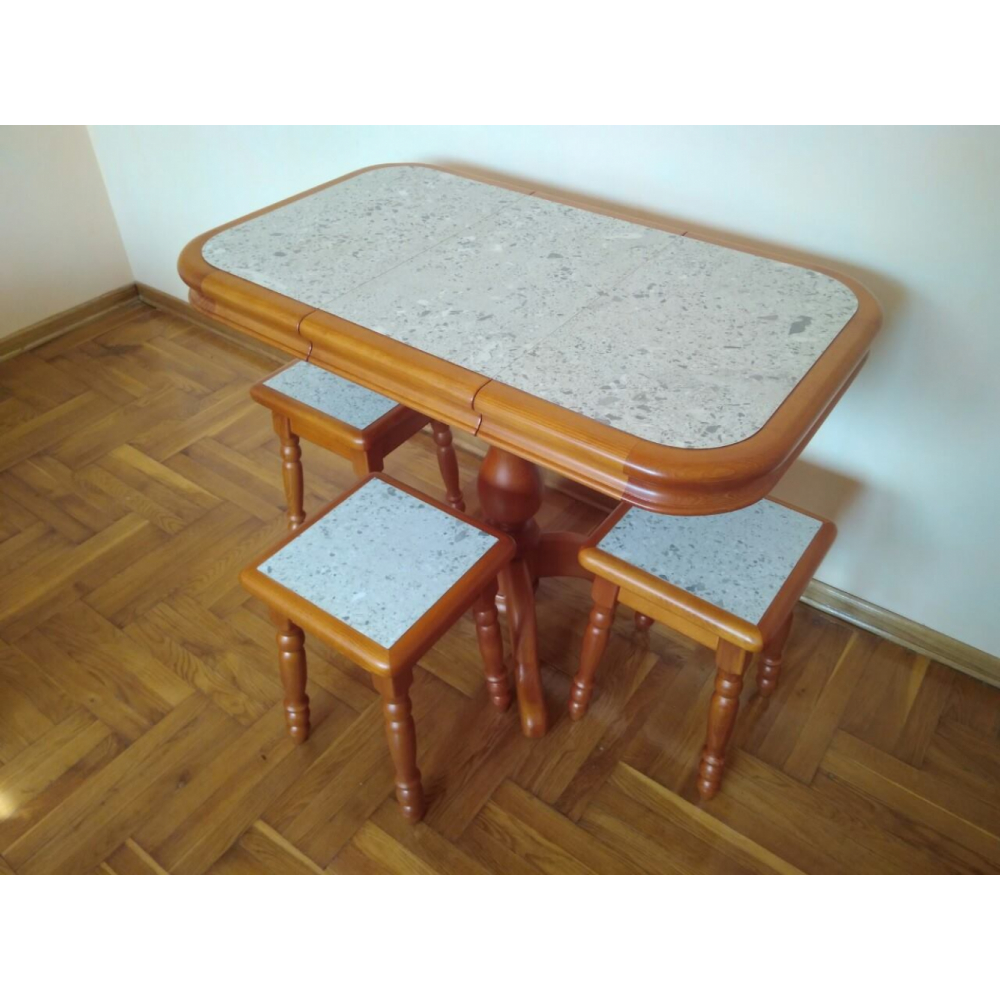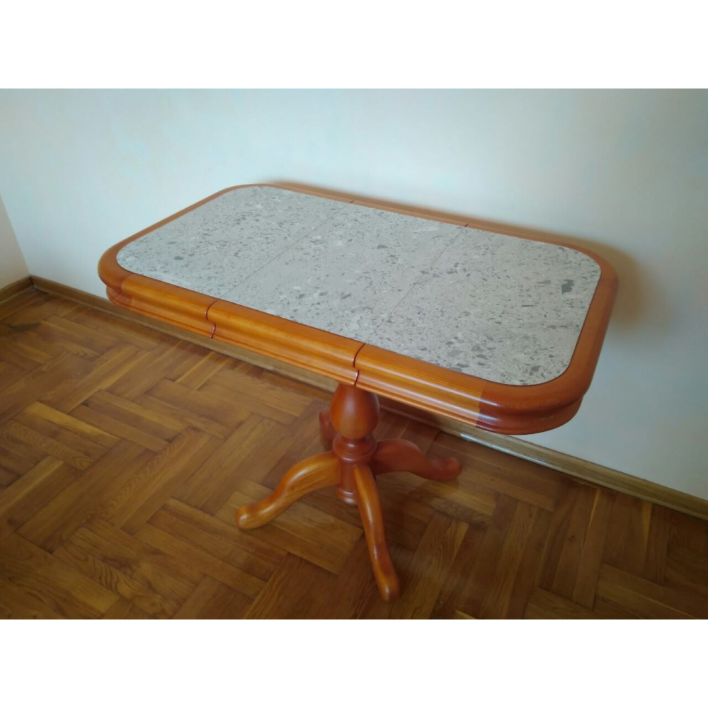 Стіл - деревяний, розкладний. Кришка стола заокругленна, виготовленна з стільниці з HPL покриттям. Ніжка 1, фігурна. Розмір: 1м 67см + 35см(вставка)