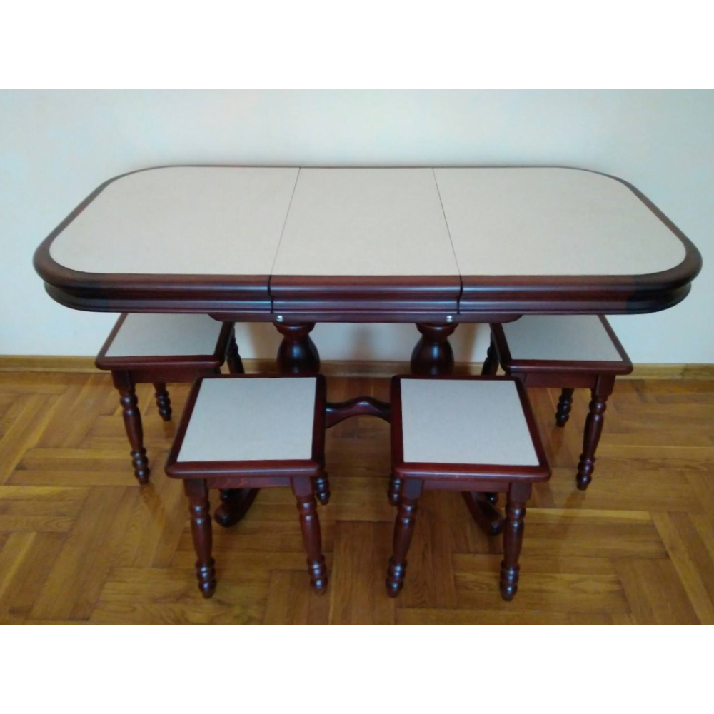 Стіл - деревяний, розкладний. Кришка стола заокругленна, виготовленна з стільниці з HPL покриттям. Ніжки 2, фігурні. Розмір: 1,2м 67см + 35см(вставка)