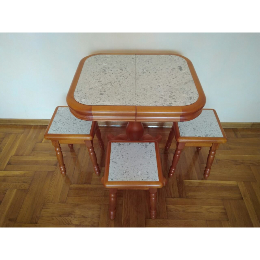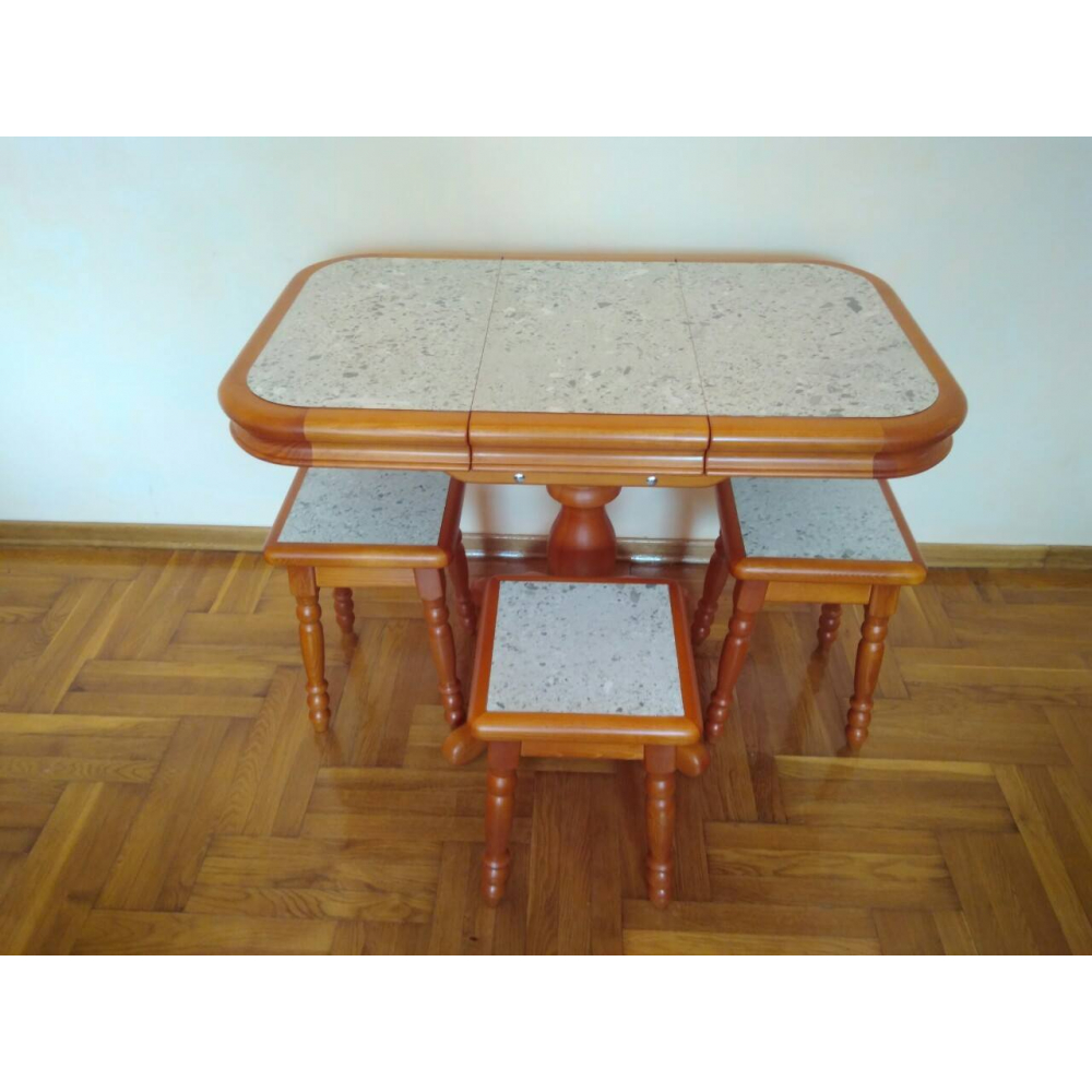 Стіл - деревяний, нерозкладний. Кришка стола заокругленна, виготовленна з стільниці з HPL покриттям. Ніжка 1, фігурна. Розмір: 1м 67см + 35см(вставка)