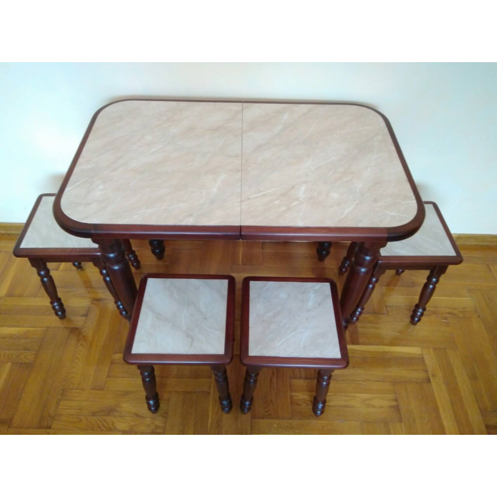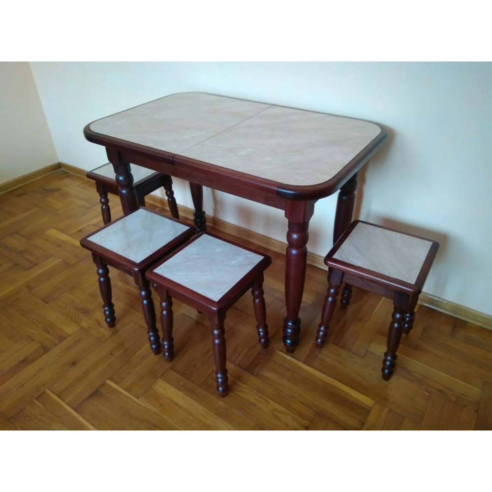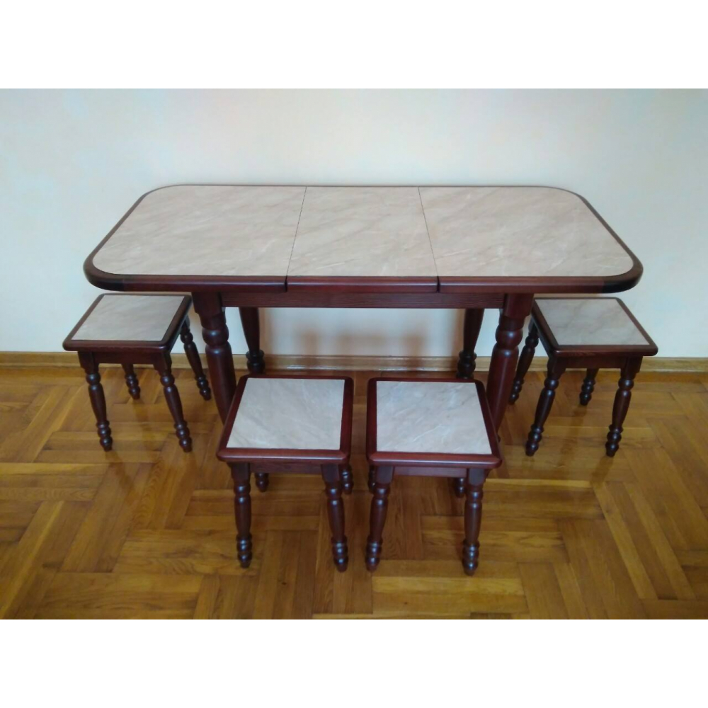 Стіл - деревяний, розкладний. Кришка стола заокругленна, виготовленна з стільниці з HPL покриттям. Ніжки 4, точені. Розмір: 1,2м 64см + 35см(вставка)