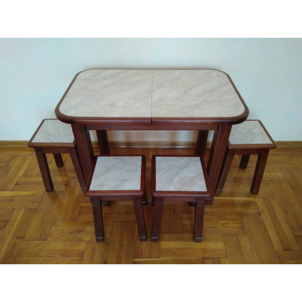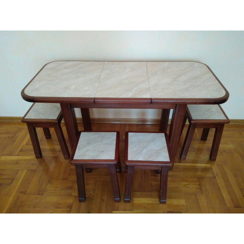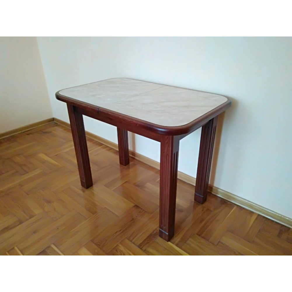 Стіл - деревяний, нерозкладний. Кришка стола заокругленна, виготовленна з стільниці з HPL покриттям. Ніжки 4. Розмір: 1м 64см + 35см(вставка)