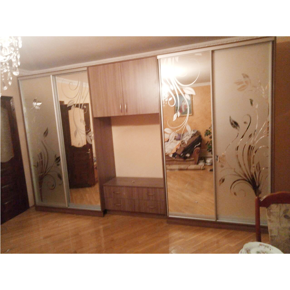 Шафа-купе з тумбочкою для ТВ, двері - дзеркало з піскоматуванням (Фон дзеркальний та матовий)Розмір: 4000 х 600 х 2400Колір розсувної системи - Срібло