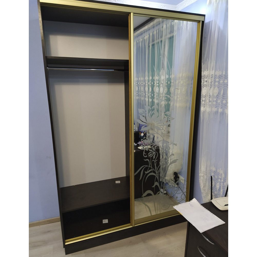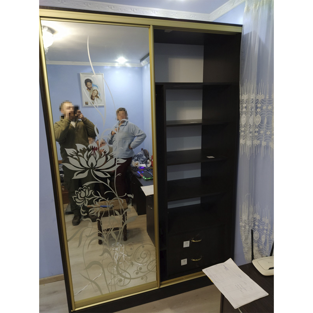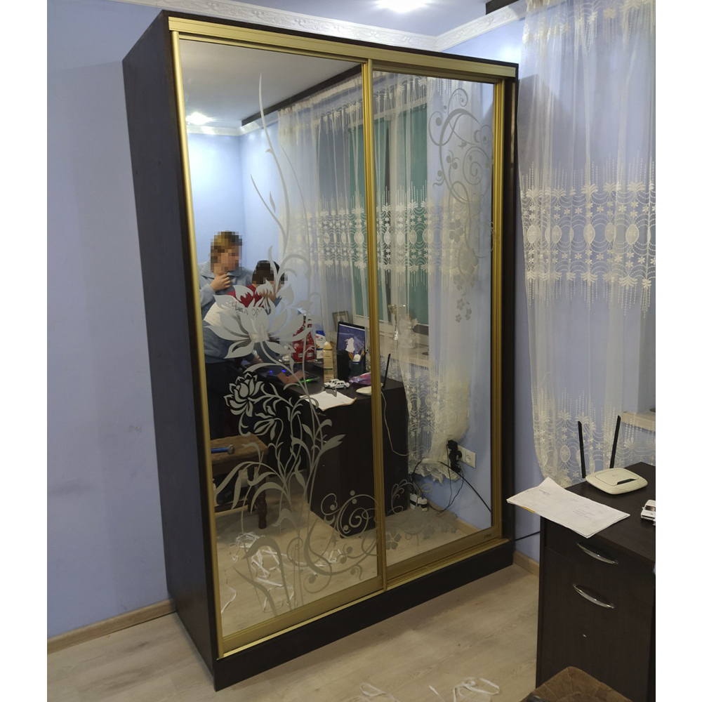Шафа-купе Холм - хороший вибір, якщо вам потрібна маленька і вмістка шафи-купе. Ця шафа-купе є 2-х дверною, а її двері дзеркальні з малюнком зробленим з піскострую. Розмір - Індивідуально. Колір розсувної системи - Золотий.