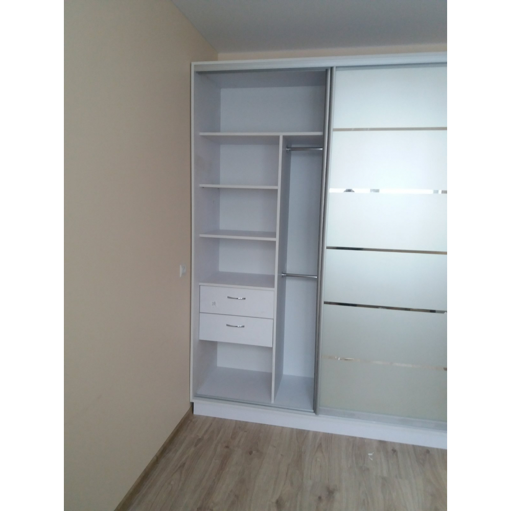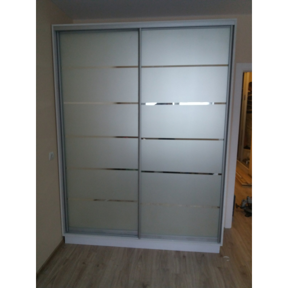 Шафа-купе має 2 дверей, які зроблені з Дзеркала (піскоструй з дзеркальним візерунком).Розмір: Індивідуальний.Колір розсувної системи - Срібло.