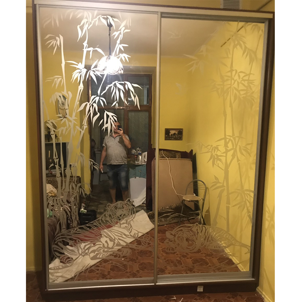 Шафа-купе 2-х дверна, двері дзеркало + піскоструй, малюнок - бамбукРозмір: 1500 х 600 х 2400Колір розсувної системи - Золото