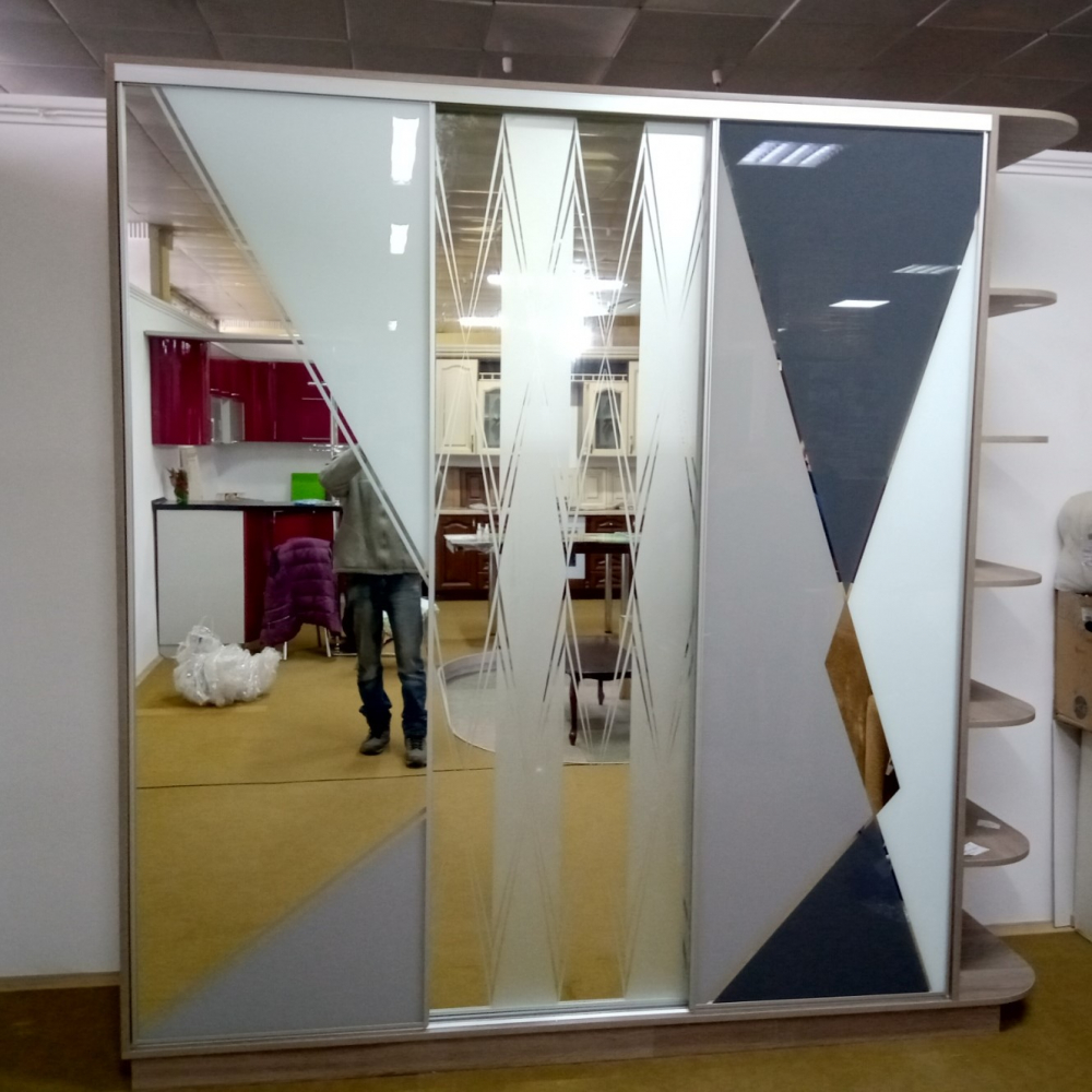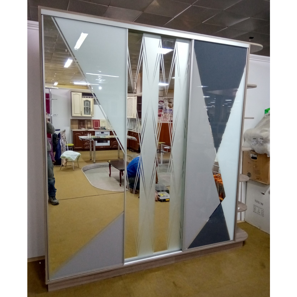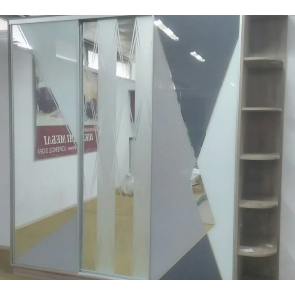 Шафа-купе має 3 дверей, які зроблені з Дзеркало+Лакобель і має кутове закінчення.Розмір: Індивідуальний.Колір розсувної системи - Срібло.