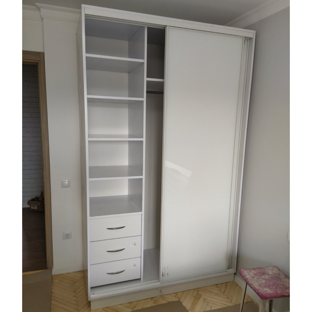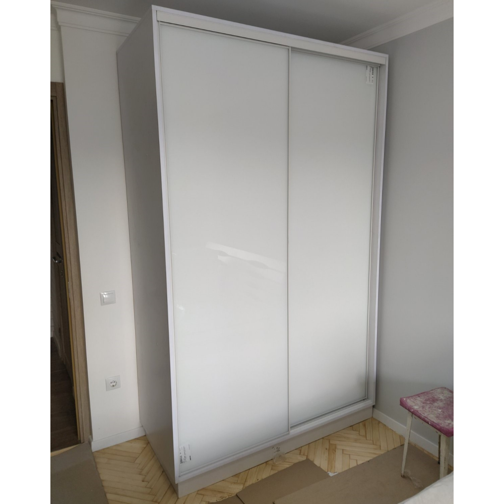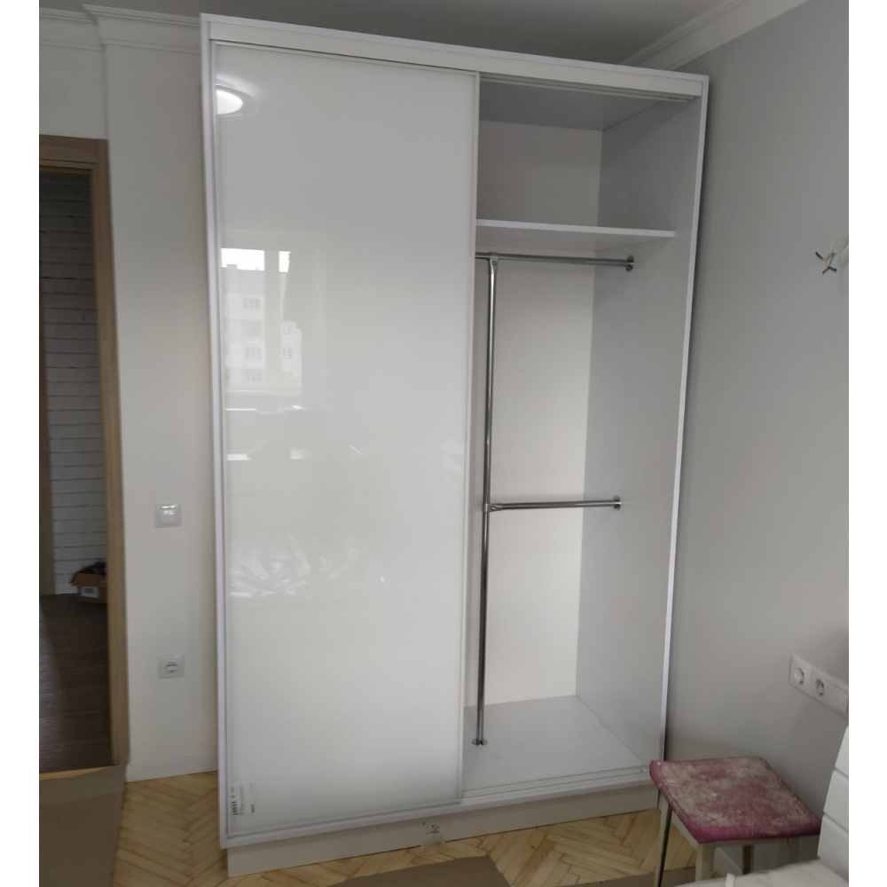Це 2-х дверна стильна і модна шафа-купе.Двері: Лакобель білий.Розмір: Індивідуально.Колір розсувної системи: Срібло.Всередині шафи-купе є полички для розміщення речей і місце для вішання верхнього одягу.