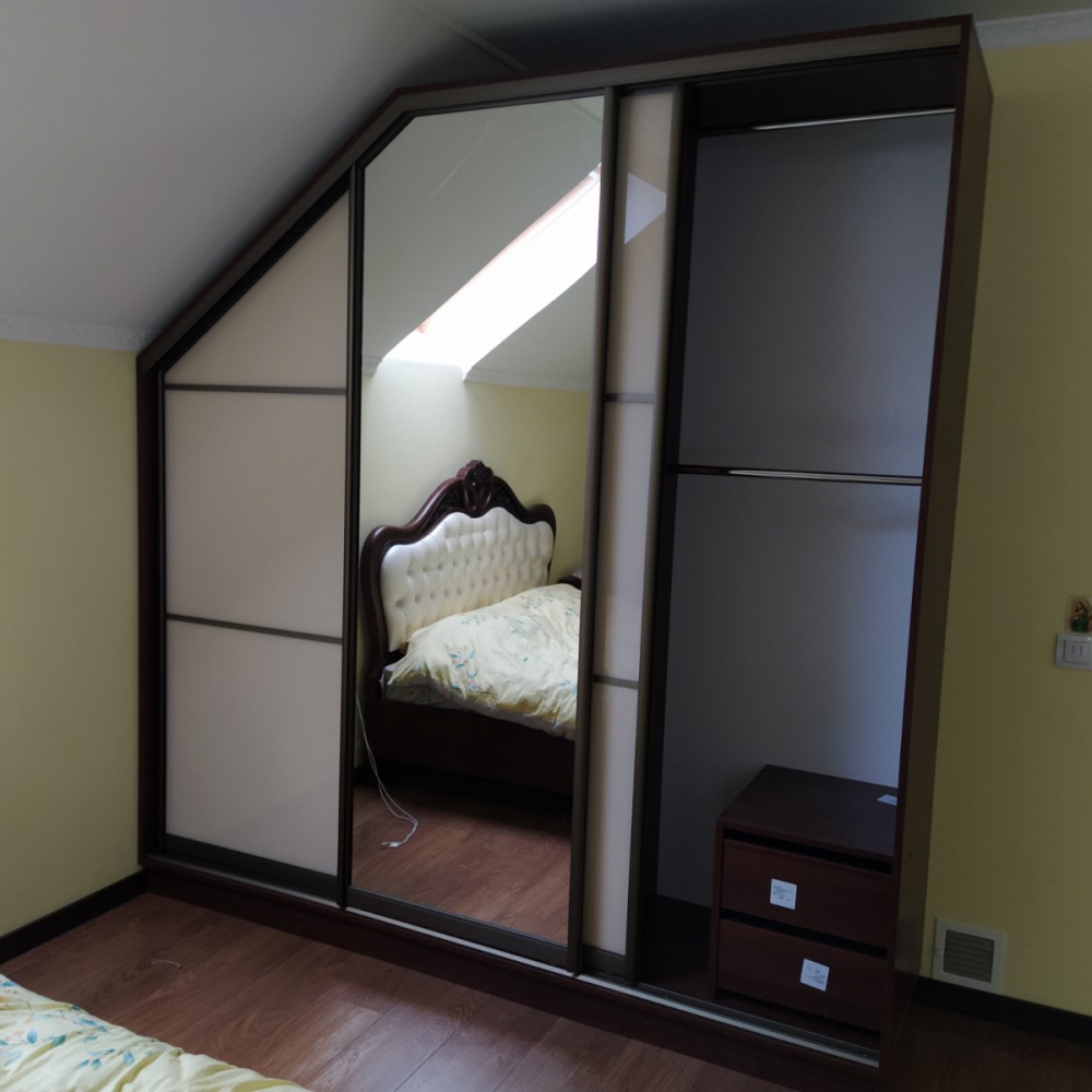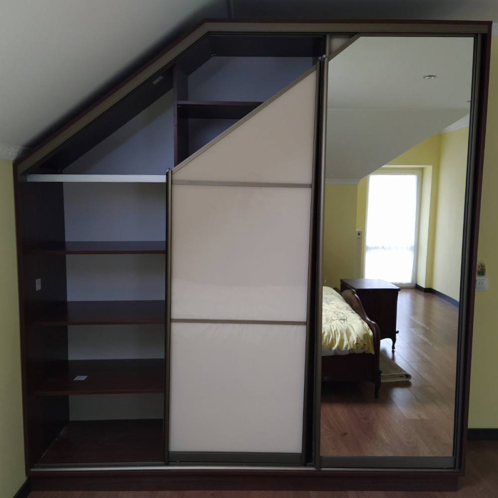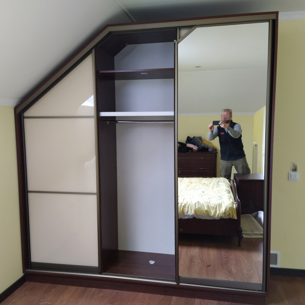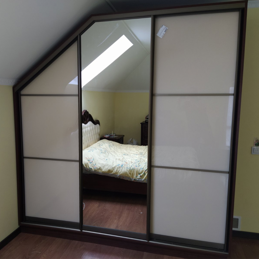 Це 3-х дверна стильна шафа-купе.Двері: Лакобель білий і Дзеркало.Розмір: Індивідуально.Колір розсувної системи: Золото.