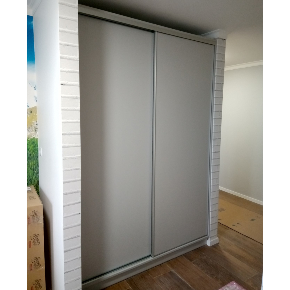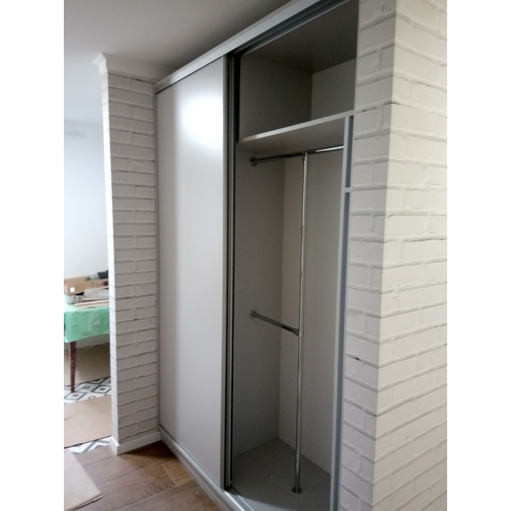 2-х дверна вмонтована шафа-купе, двері - ДСП.Розмір: Індивідуально.Колір розсувної системи - Срібло.Всередині шафи-купе є полички для розміщення речей і місце для вішання верхнього одягу.