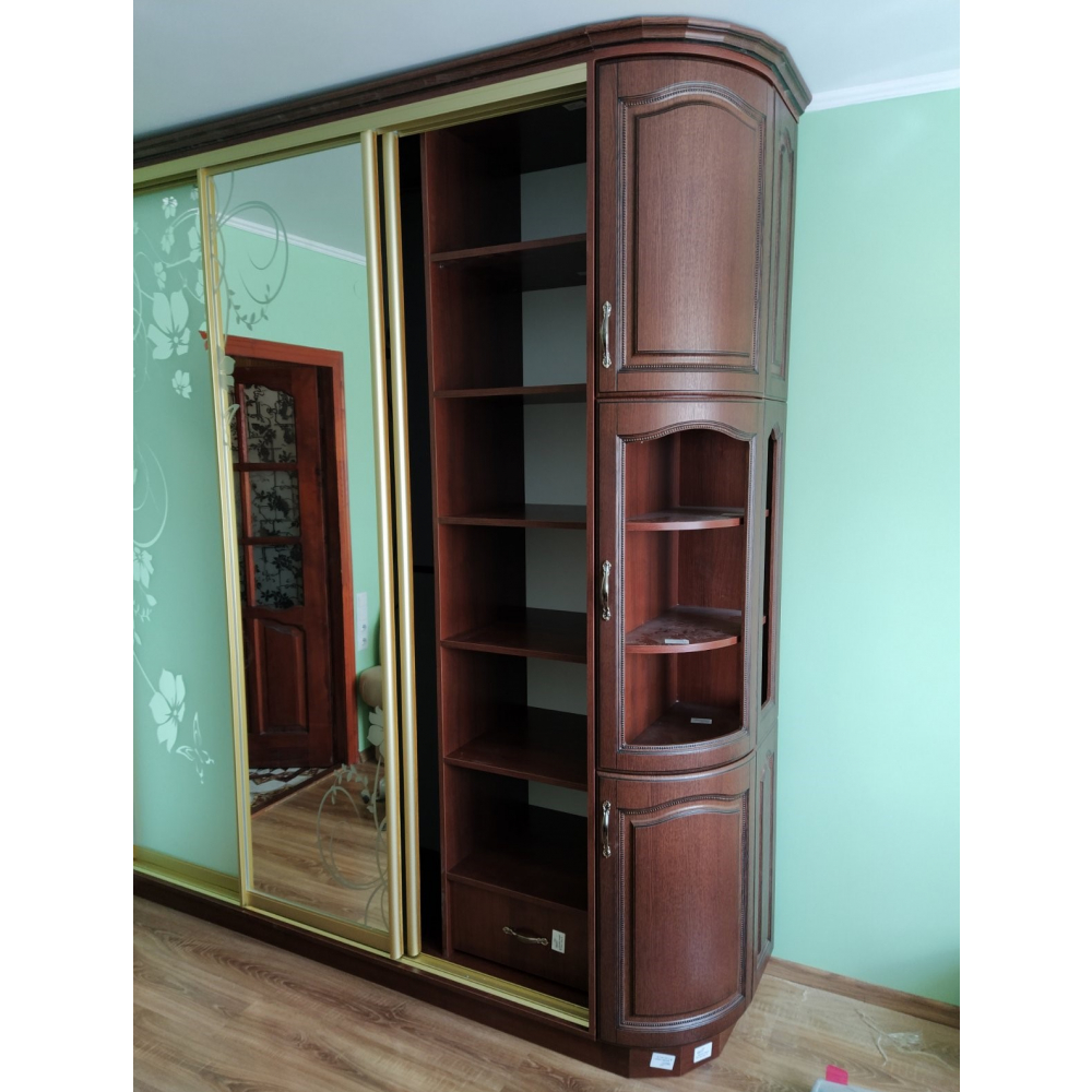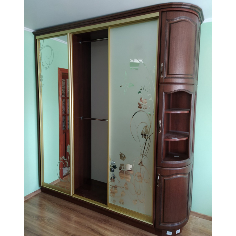 Шафа-купе з кутовим закінченням.Двері - дзеркало з піскоматуванням.Розмір: Індивідуально.Колір розсувної системи - Золото.