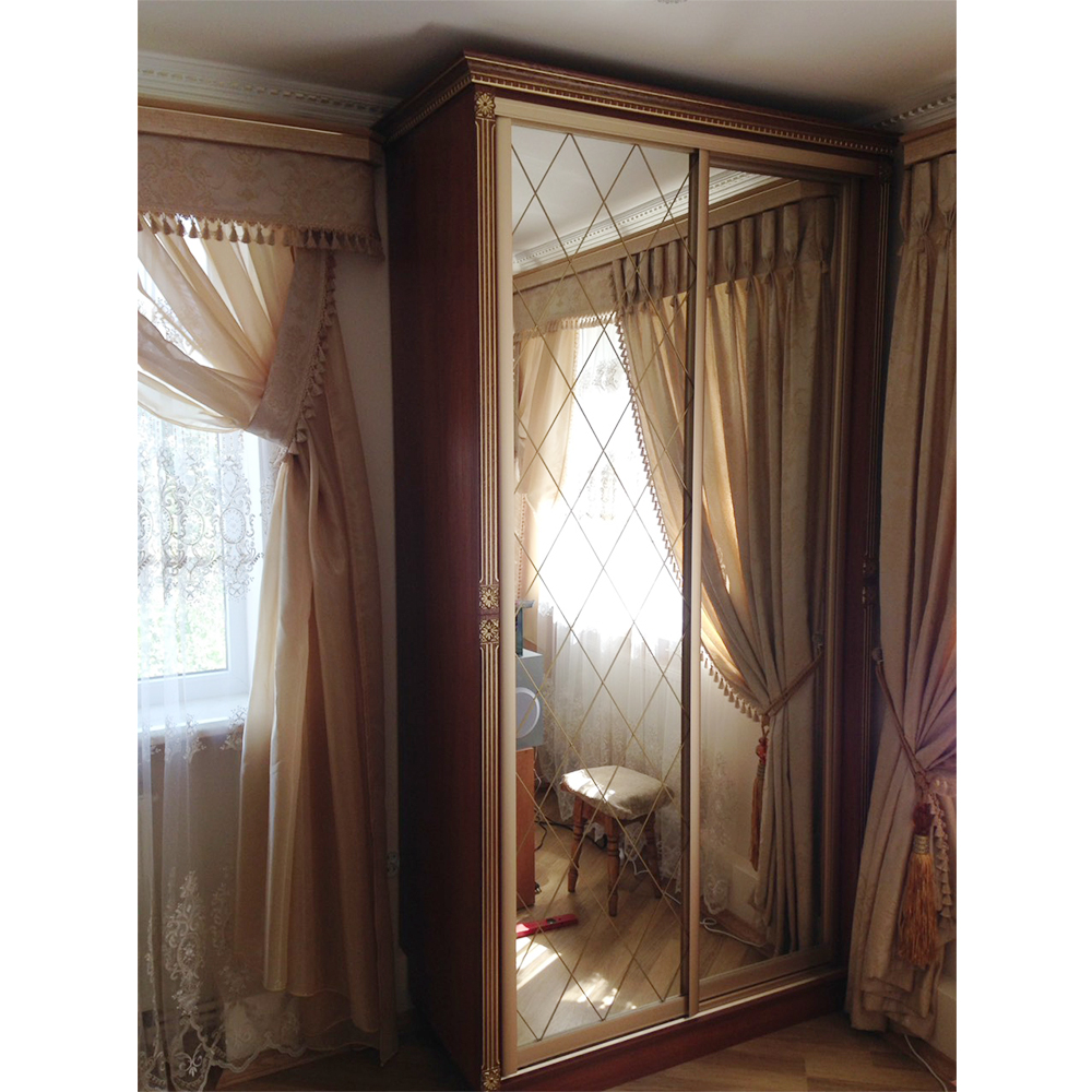 Шафа-купе 2-х дверна, двері дзеркальні + вітраж, корпус прикрашений різбленими елементами МДФРозмір - 1300 х 600 х 2400Колір розсувної системи - Золото